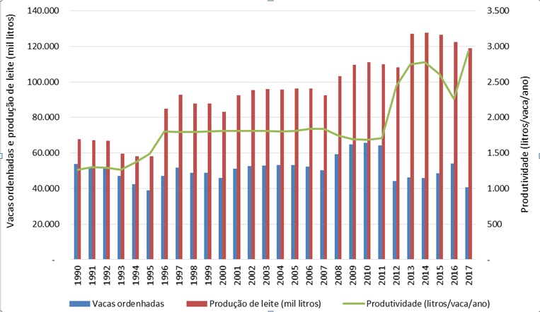 Apesar de o número de animais ter oscilado em uma faixa não muito ampla, a produção de leite em si aumentou de forma significativa e, por conseguinte, a produtividade. No início dos anos 90, a produtividade média de litros de leite por vaca por ano oscilou entre 1.200 e 1.300. Posteriormente, ficou vários anos ao redor de 1.800 litros/vaca/ano, elevando-se significativamente a partir do ano de 2012, para atingir quase 3.000 litros no ano de 2017, e algo próximo aos 120 milhões de litros produzidos.