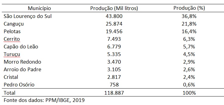 A microrregião de Pelotas é composta por 10 municípios: Arroio do Padre, Canguçu, Capão do Leão, Cerrito, Cristal, Morro Redondo, Pedro Osório, Pelotas, São Lourenço do Sul e Turuçu. A produção da microrregião em 2017 foi de quase 119 milhões de litros de leite (Tabela 1).
